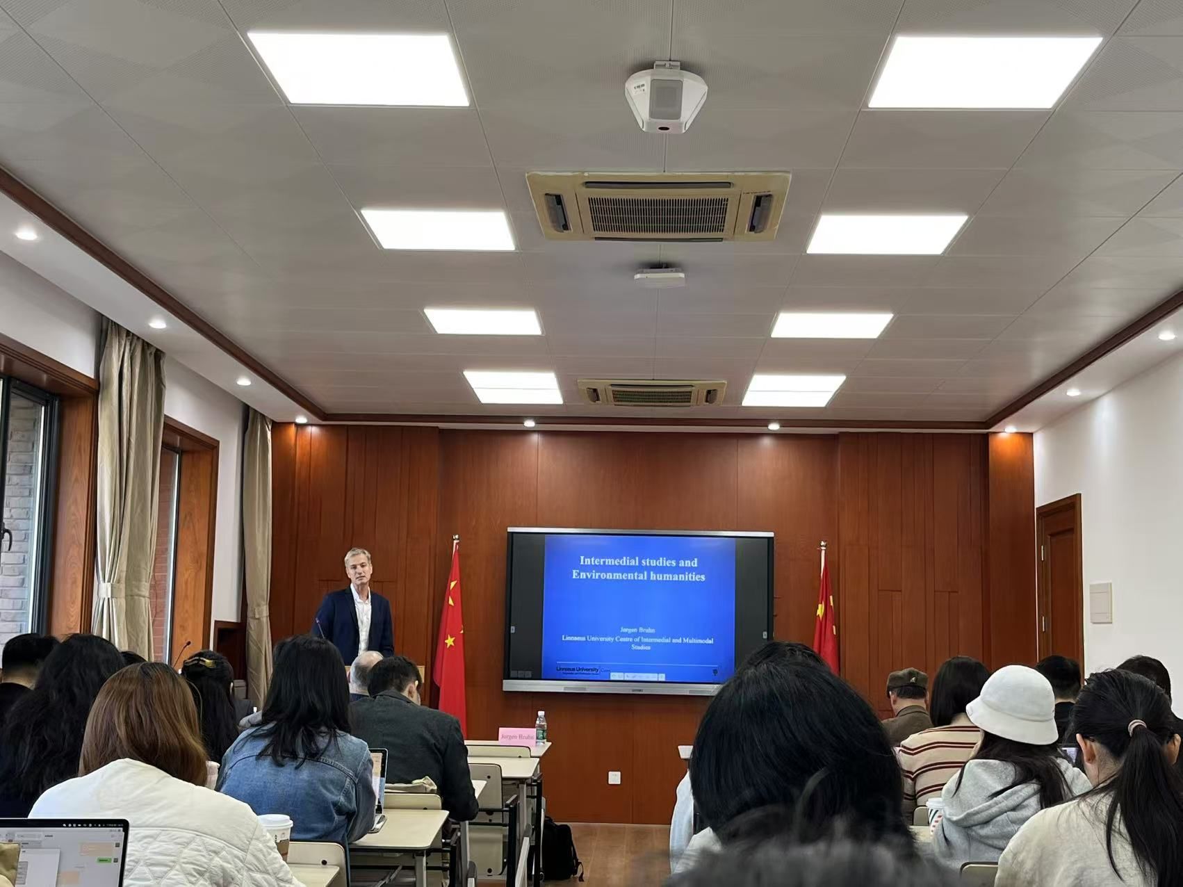 The lecture series by Professor Bruhn offered a multidimensional view of Linnaeus University's leading research in intermediality—especially in the area of "intermedial ecocriticism." Methodologically, his work is characterized by three main features: integrating intermedial comparison with ecocriticism, directly engaging with the crises of knowledge production and representation in the context of the Anthropocene; introducing innovative concepts such as "truthfulness" and "environmental grotesque" to reassess the potential and limits of media in climate communication and cultural imagination; rethinking intermedial theory from the angles of subjectivity, AI-driven synthetic production, and philosophy of technology, thereby opening up new ethical and theoretical questions. This series of events has advanced NJU's international dialogue in global humanities and interdisciplinary methodologies, while also laying a solid foundation for future curriculum development and collaborative projects.