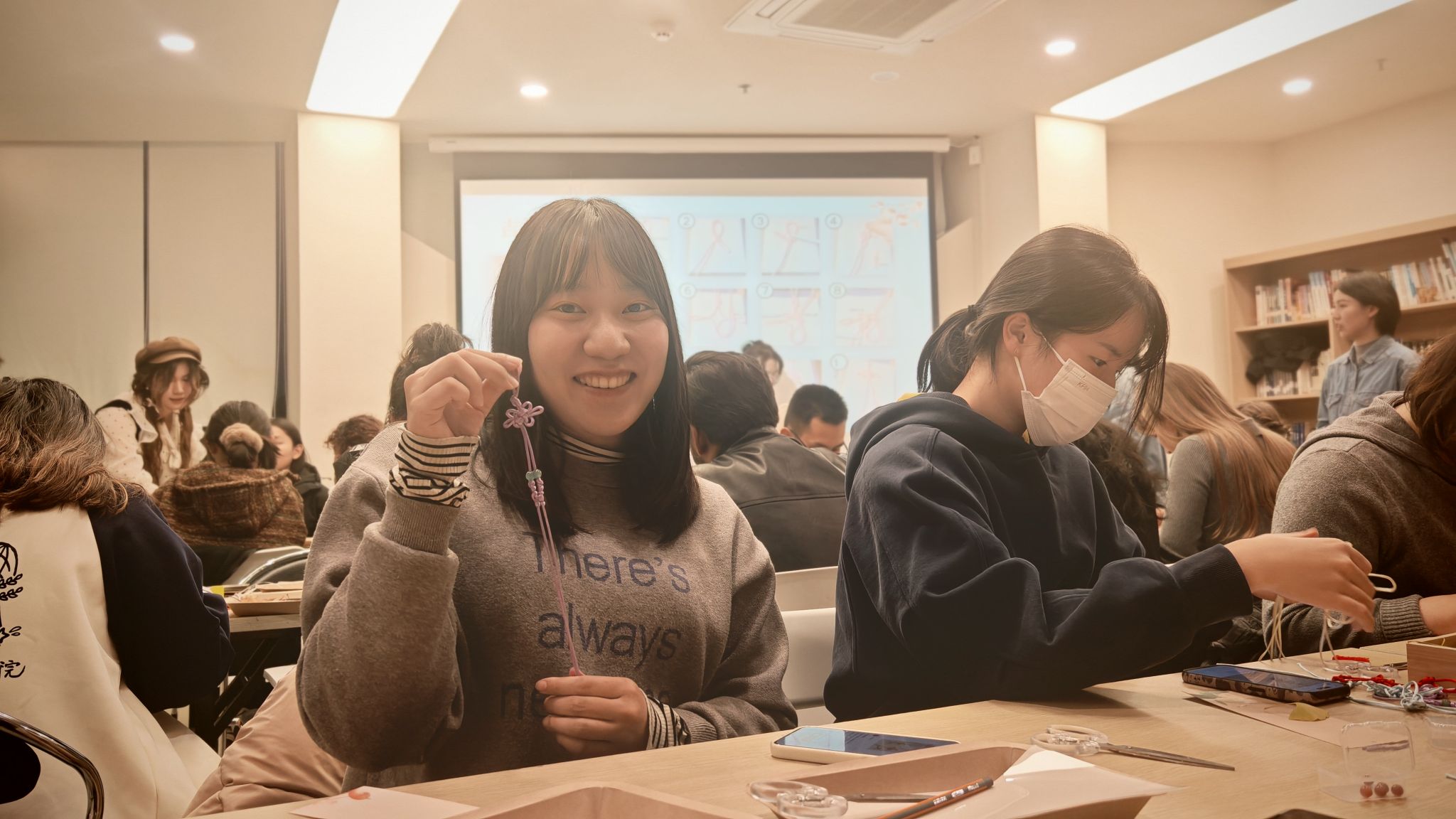 In the second part ,organizers of the activity used vivid illustrations and videos to introduce the cultural background of fallen-leaf bookmarks. For Chinese people, picking up fallen leaves and turning them into bookmarks symbolize the continuation of life in another from.This handmade practice reflects the idea of ‘cherishing objects and revering the nature’, which is a traditional Chinese life philosophy. As for the Chinese knot, the host described its evolution from a practical tool for recording history into a cultural symbol embodying good fortune and blessings. “I have seen images of Chinese knots on the Internet quite often”, said Emmanuel from France, “But it’s the first time for me to know there are even different meanings behind various patterns of knots.”