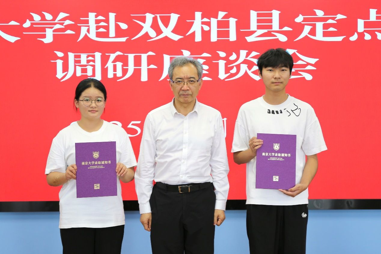 Tan Zhemin presented admission letters to two graduates of Shuangbai No.1 Middle School and new students of NJU