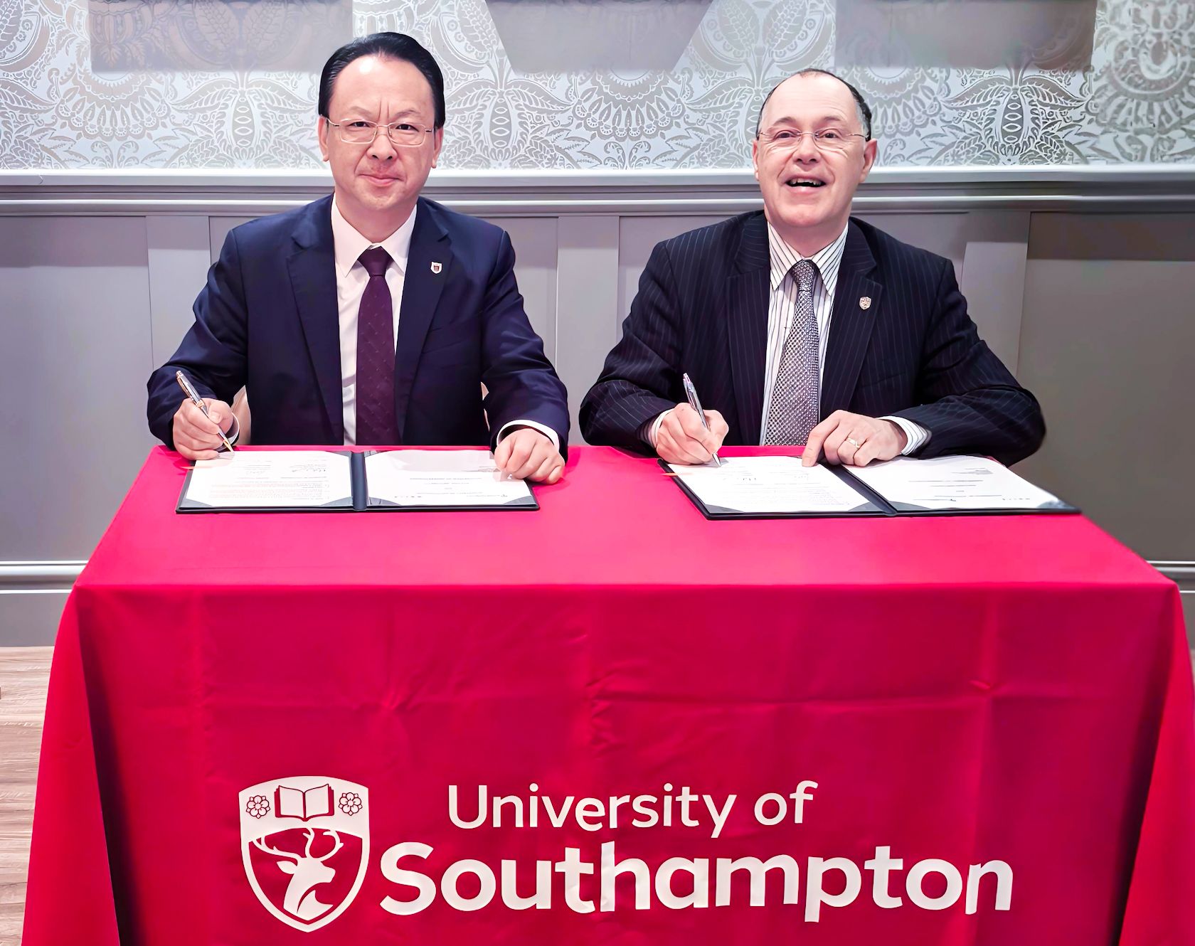 当天,谭铁牛一行还访问南安普顿大学,与校长马克・史密斯(Mark Smith)座谈并签署合作协议。谭铁牛介绍了南大在地理与海洋科学、大气科学、人工智能等学科的综合实力与发展规划,并表示两校在海洋环境治理、数字技术应用等领域合作前景广阔。史密斯介绍了该校作为罗素集团创始成员之一在海洋科学、船舶工程、光学工程等领域的学科优势及科研成果,并分享了与中国高校合作的成功实践,期待深化两校合作。双方将进一步拓展全球人文+人工智能、生命健康、海洋环境等领域合作。