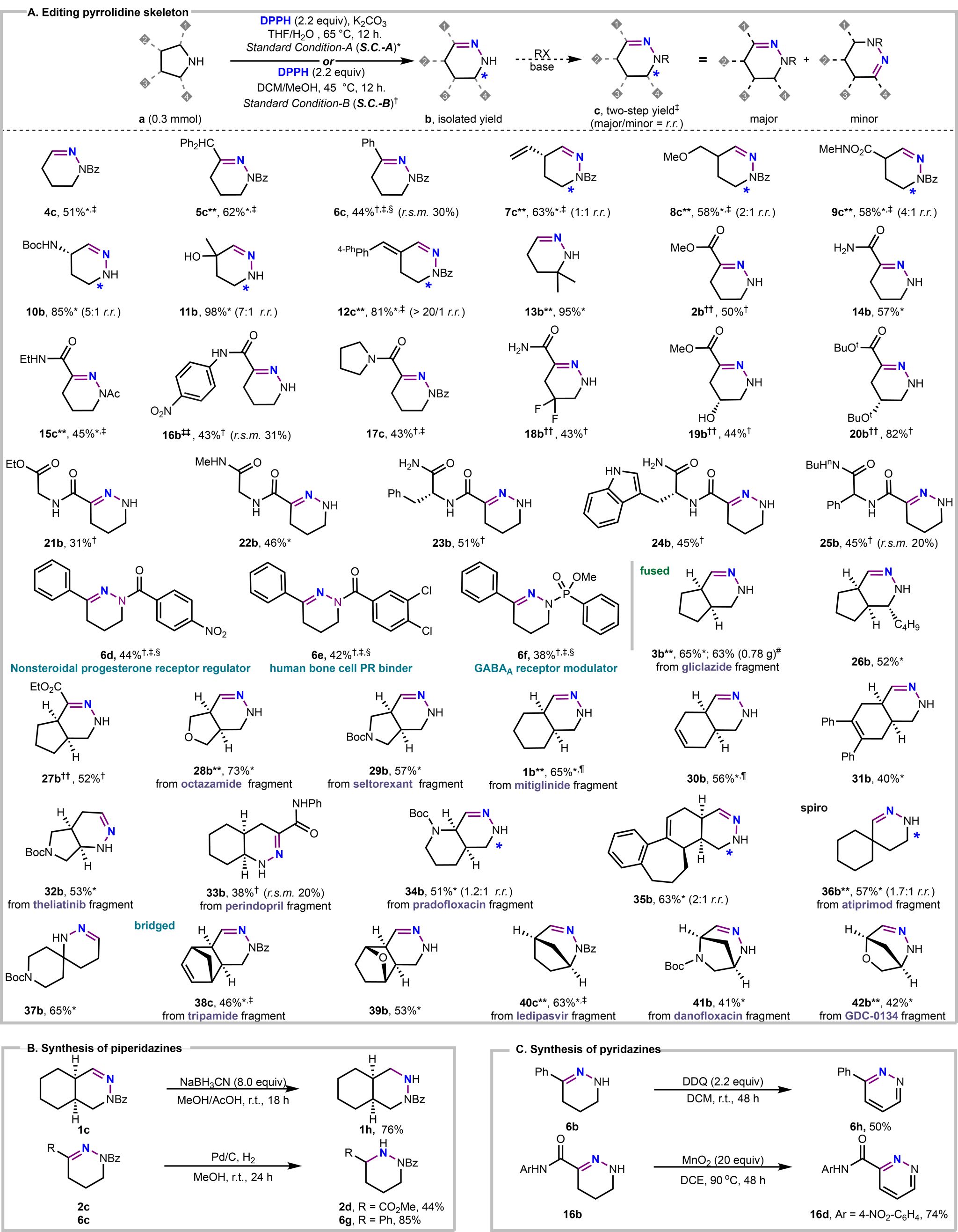 含氮杂环化合物(N-杂环)是医药化学中最重要且多功能的骨架之一,是调节分子识别、药物动力学以及理化性质的关键元素。最常见的骨架包括六元的吡啶和哌啶,五元的吡咯烷等(图1A)。鉴于它们的广泛性和结构多样性,开发直接编辑N-杂环的策略具有实际意义。最近,多个课题组利用π键活化路径对N-杂芳香族体系的氮插入反应研究并取得了非常出色的成果(图1B);但直接向饱和氮杂环插入氮原子形成二氮杂环仍未见报道,这是因为缺乏共轭体系,π键活化路径受到极大限制,同时选择性地裂解和重新形成C–N或C–C键则要求对反应性和选择性具有极高的控制能力。本文报道了一种新型的氮原子插入策略:利用商业化试剂O-二苯基磷酰基羟胺(DPPH)(图1C),将氮杂环-吡咯烷骨架转化为二氮杂环-四氢哒嗪骨架化合物。该转化操作简便、条件温和且具有优异的官能团兼容性。所得四氢哒嗪同时具备亲核性氨基(NH)和活性碳氮双键(C=N),可选择性氧化或还原得到饱和1,2-哌嗪或芳香哒嗪,而这些结构在最近的药物得到了越来越多的应用(图1D)。
