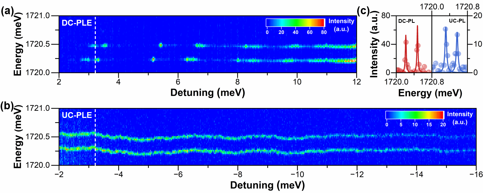 图1:单个CsPbI3纳米晶在4 K低温下的2D (a) 下转换荧光激发谱 (DC-PLE)和 (b) 上转换荧光激发谱 (UC-PLE)图像。(c) 从(a)和(b)白色虚线位置提取的下转换荧光谱(DC-PL)和上转换荧光谱(UC-PL)。