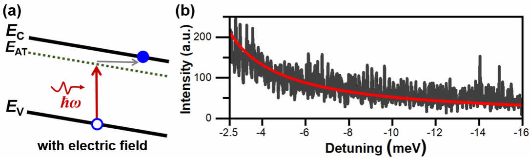 图2:(a) 低于带隙能量的激光光子与单个CsPbI3纳米晶进行作用产生上转换荧光发射的过程。EC:导带底;EV:价带顶;EAT:电致吸收尾带。(b)实验测量得到的1D上转换荧光激发谱(黑色)及理论计算得到的Franz-Keldysh电致吸收尾带(红色)。