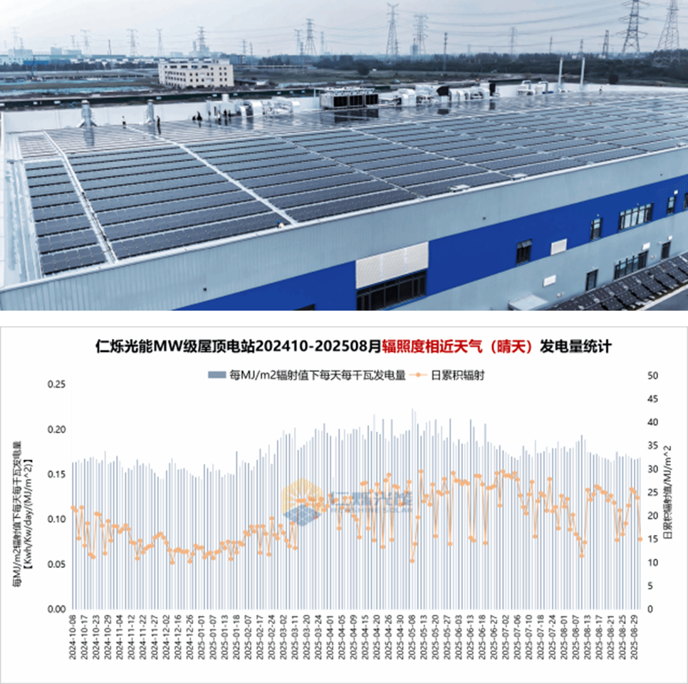 图5. 仁烁光能MW级钙钛矿组件示范项目及组件发电量同辐照关系