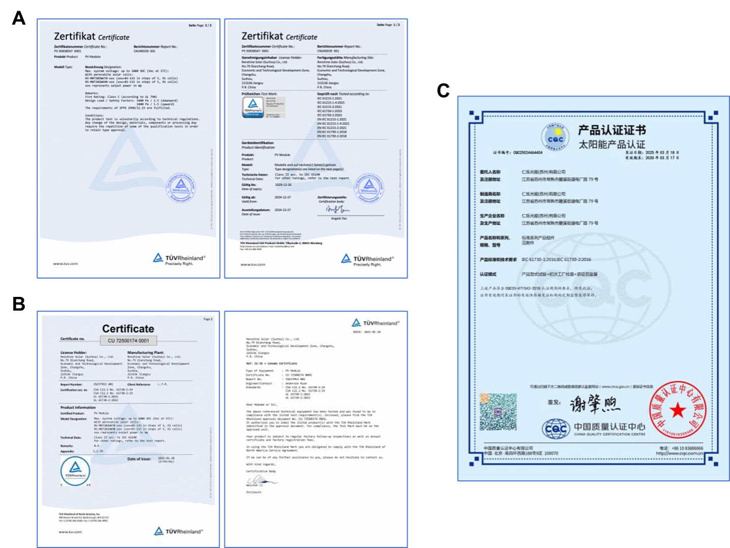 图4. 组件可靠性及质量认证。(A)德国莱茵TÜV全序列IEC认证证书。(B)美国UL认证证书。(C)中国质量认证中心产品认证证书。