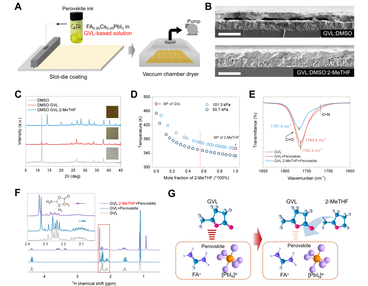 图1. 采用GVL/DMSO/2-MeTHF混合溶剂体系制备钙钛矿薄膜。(A)狭缝涂布法和VCD工艺大规模制备钙钛矿薄膜的过程。(B)钙钛矿薄膜横截面SEM图像。(C)VCD后的钙钛矿薄膜中间相对比。(D)GVL/2-MeTHF混合液的等压气液平衡图。(E和F)钙钛矿的FTIR光谱(E)和1H核磁共振谱(F)。(G)GVL和2-MeTHF与钙钛矿的配位结构示意图。