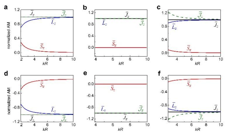 图3:在不同边界条件的柱状波导中,具有不同拓扑荷数的声场的Minkowski自旋、轨道及总角动量和Abraham总角动量随波导半径变化的趋势。(a) l=+1,绝对硬边界;(b) l=+1,绝对软边界;(c) l=+1,纯抗边界;(d) l=−1,绝对硬边界;(e) l=−1,绝对软边界;(f) l=−1,纯抗边界。