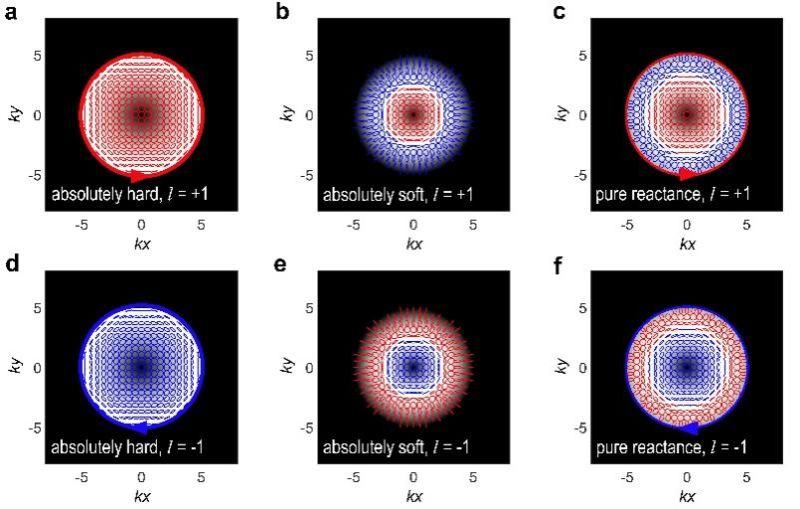 图2:在不同边界条件和不同拓扑荷数时,波导中涡旋声场横截面的声压幅值(灰度背景)分布及速度场 (vx,vy)的极化椭圆。(a) 绝对硬边界,l=+1;(b) 绝对软边界,l=+1;(c) 纯抗边界,l=+1;(d) 绝对硬边界,l=−1;(e) 绝对软边界,l=−1;(f) 纯抗边界,l=−1。波导的无量纲半径为 kR=5。红色和蓝色分别对应右旋(Sz>0)和左旋(Sz<0)的椭圆极化。边界处粗红、蓝箭头的方向和粗细分别表示边界Abraham动量密度的方向和大小。