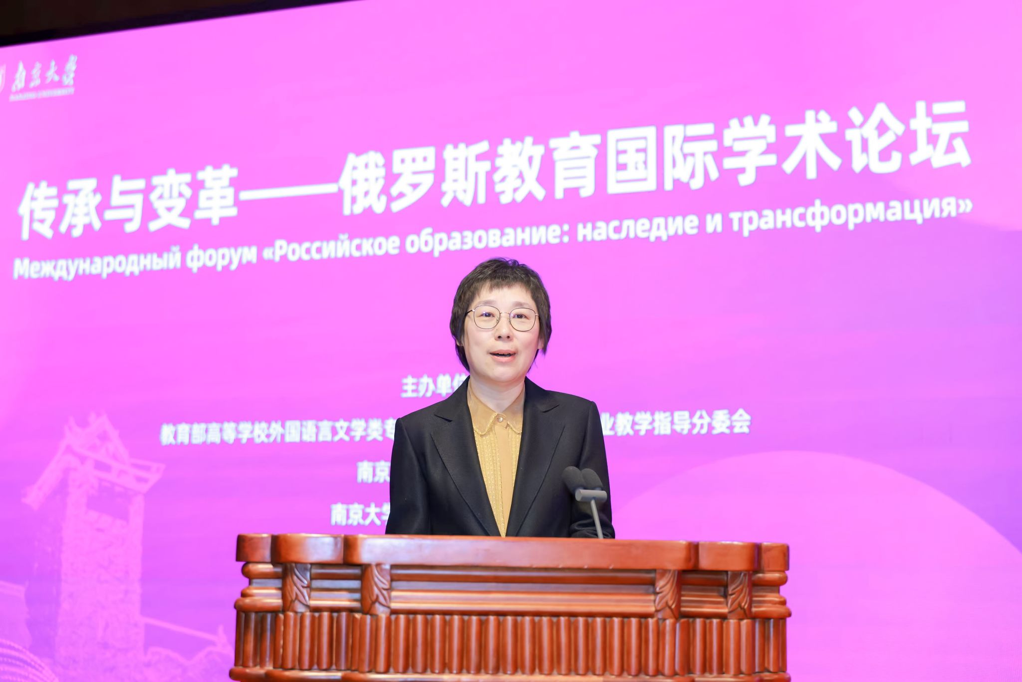 本次论坛由教育部高等学校外国语言文学类专业教学指导委员会俄语专业教学指导分委会、南京大学外国语学院、南京大学俄罗斯学研究中心联合主办,外语教学与研究出版社协办,吸引了来自中国、俄罗斯、哈萨克斯坦等国的百余位专家学者参与。即将于2026—2027年举办的“中俄教育年”,是两国元首为擘画新时代中俄全面战略协作伙伴关系作出的重要部署。在此背景下,论坛聚焦中俄教育问题展开深入讨论,具有重要的理论探索与战略意义。